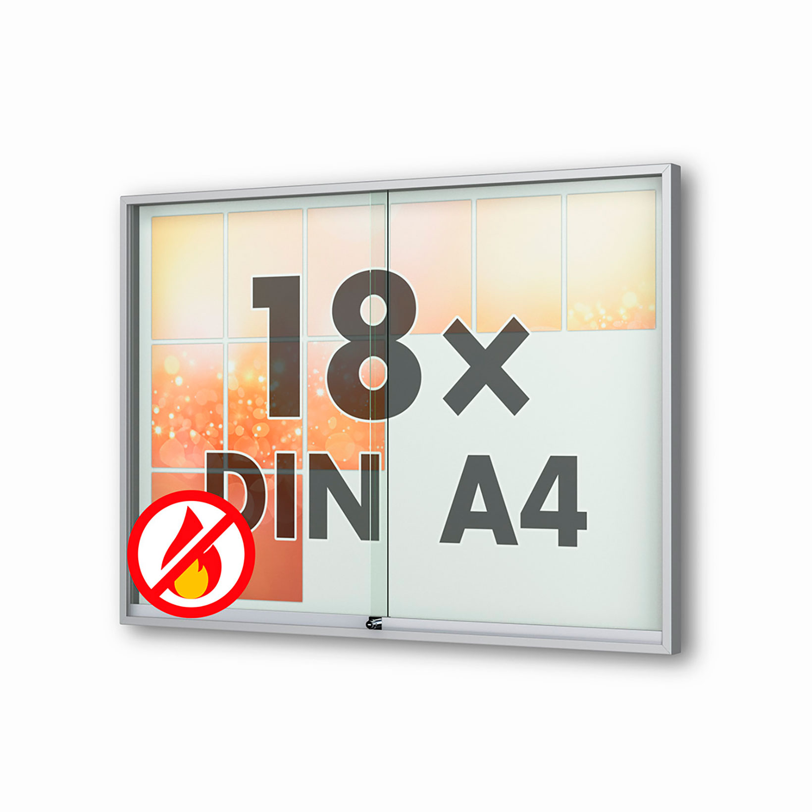 Schaukasten Fortis - eckig - mit Schiebetüren -210 mm Gehäusetiefe, rollengelagerte Schiebetüren, höchster Brandschutz (A1) Größe - 18 × DIN A4 • 1370 × 1010 mmSichtfläche: 1330 x 950 mm Öffnung - rollengelagerte SchiebetürenVerglasung - Einscheiben-Sicherheitsglas / ESGOberfläche - Eloxierung in matt-silber (E6/EV1)Beleuchtung - ohne BeleuchtungSchließung - Sicherheitsschlösser mit je 2 SchlüsselnRückwand - weiße, magnethaftende Rückwand inkl. 10 Magnete