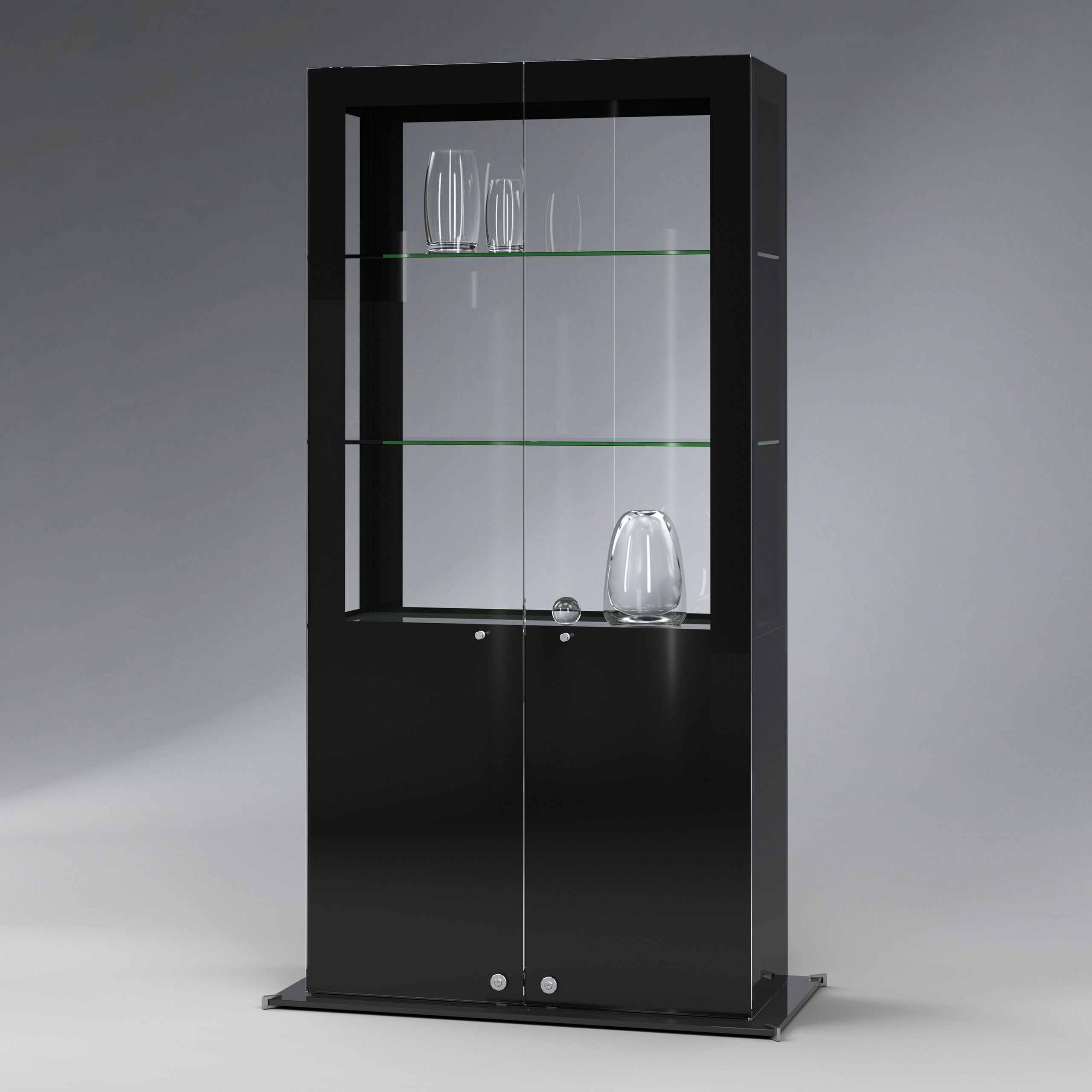 Merkmale Vitrine: Farbe schwarz, abschliessbar, mit Drehtüren, stehend