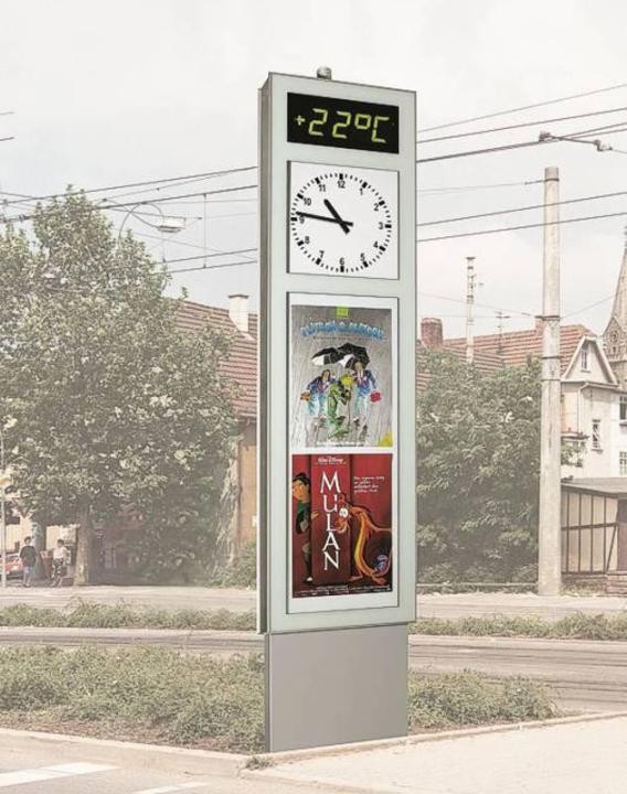 - Ziffernblatt aus schlagzähem, weißen Acrylglas mit Stundenbalken bedruckt, im Durchmesser von 500 mm revisionsfreundlich befestigt und vollflächig hinterleuchtet
